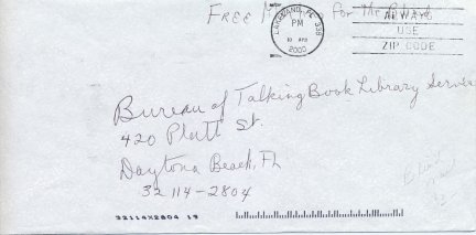 An envelope using the "Free Matter for the Blind" postal rate mailed to the Florida Bureau for Talking Book Library Service in Daytona Beach in April, 2000.