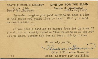 1953 postal card was mailed from the Division for the Blind of the Seattle