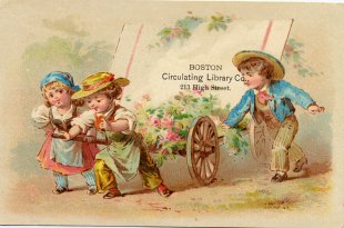 In the late 19th century Americans began collecting a variety of souvenirs and souvenir like artifacts. These collections were stimulated by the 1876 Centennial Exposition in Philadelphia and the 1893 World's Columbian Exposition in Chicago. Trade cards which advertised a business and included an attractive illustration were highly collectible. One of the businesses that used trade cards to advertise were circulating libraries. Circulating libraries were for-profit rental libraries that were started in the United States in the second half of the 18th century. They were an alternative to the subscription and membership libraries that preceded free public libraries. The definitive book on circulating libraries is David Kaser's A Book For A Sixpence: The Circulating Library in America (Beta Phi Mu, 1980). The Trade Card Place is a website which contains extensive information about trade cards and the current collecting of those cards. I have assembled a modest collection of circulating library trade cards, some of which are depicted below.
